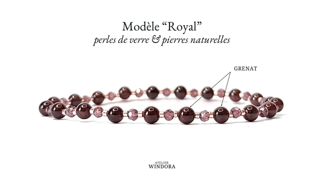 Modèle "Royal" : Grenat (4mm) et perles en verre (3mm et 2mm).