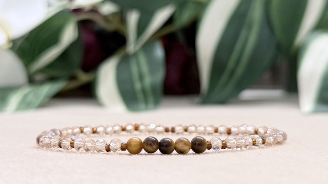 Bracelet composé de 5 pierres Oeil de Tigre (4mm) et de perles en verre (3mm et 2mm).