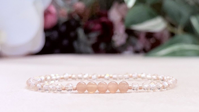 Bracelet composé de 5 pierres de Soleil (4mm) et de perles en verre (3mm et 2mm).