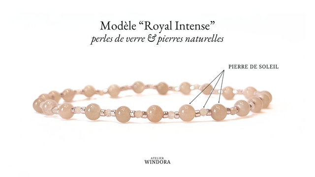 Modèle "Royal Intense" : Pierre de Soleil (4mm et 2mm) et perles en verre (2mm).