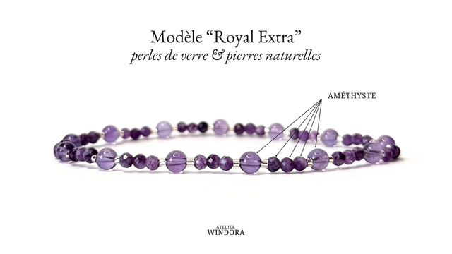 Modèle "Royal Extra" : Améthyste (4mm et 3mm) et perles en verre (2mm).