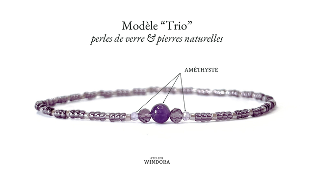 Modèle "Trio" : Améthyste (4mm et 3mm) et perles en verre (2mm).